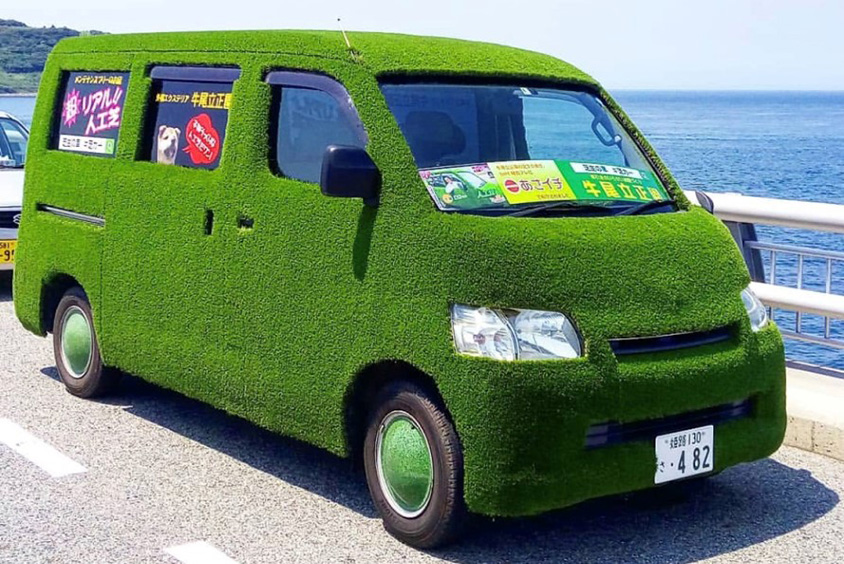 本物と見間違うような人工芝に覆われたクルマ、その名も「芝カー」。兵庫県福崎町で造園業を営む牛尾立正園の牛尾展也(のぶや)さんが、自社で扱う人工芝を自らの手で貼り付けカスタムしたクルマです。