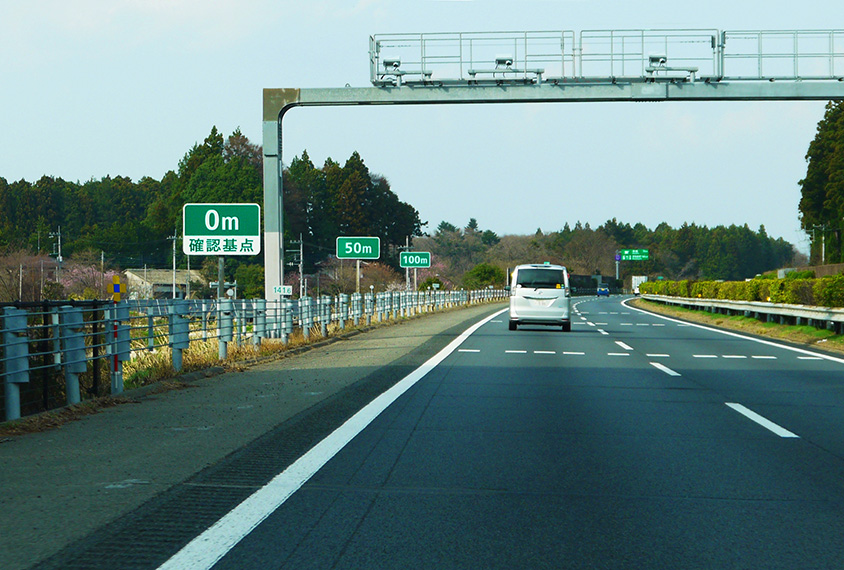 また、高速道路を走行の際は不定期に車間距離確認のための表示板が設置されています。こちらもやはり、時速80kmの区間は「0m」「40m」「80m」、時速100kmの区間では「0m」「50 m」「100m」と表示されています。
