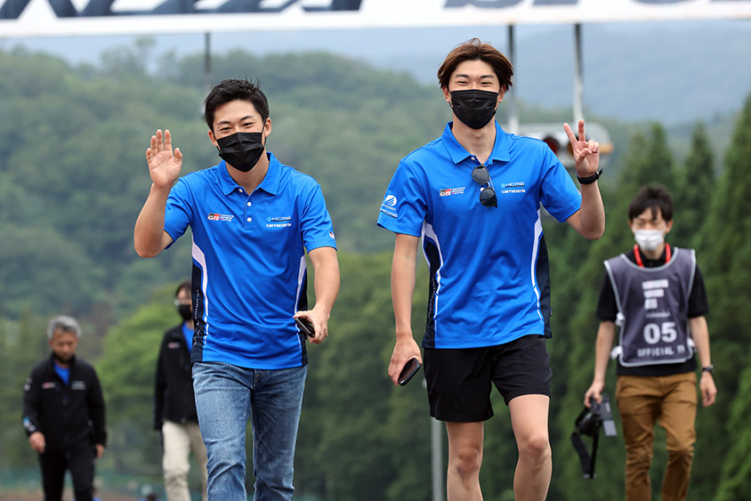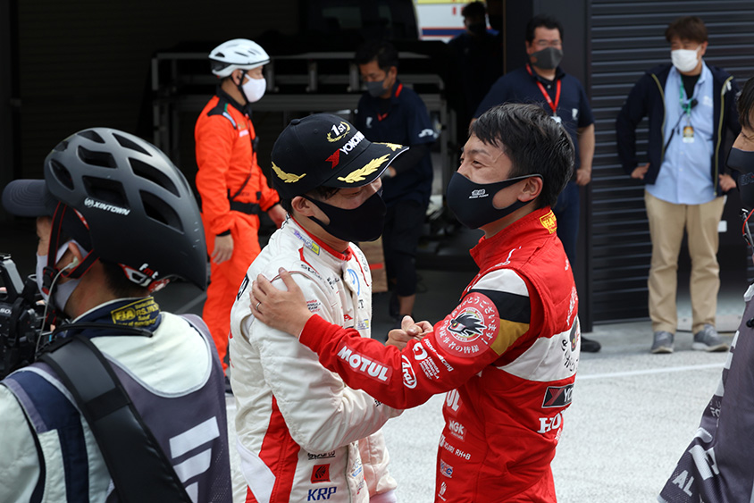 向かって左、福住選手を激励する野尻智紀選手
