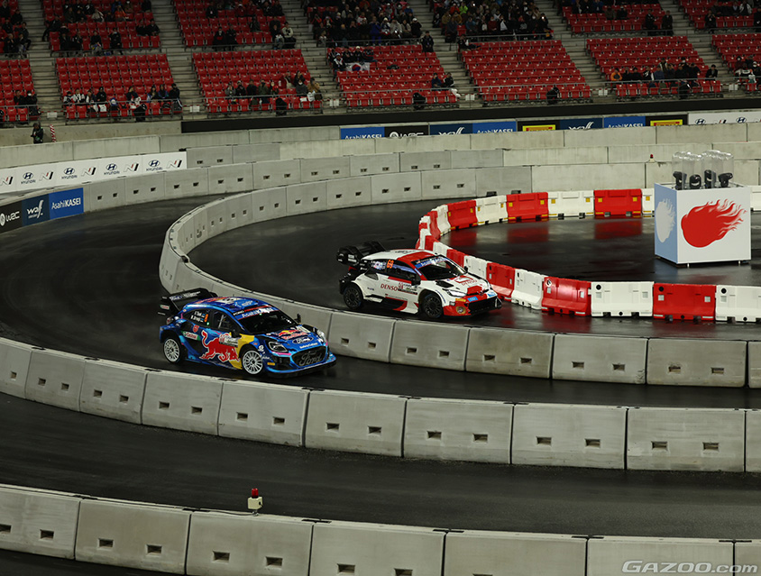 競技中に相手が見えるという事はまずありません。このスタイルは競うことがドライバー自身の目に見えるのかも。見えなくても感じるかもね。勝田貴元選手のお父様で、勝田範彦選手は、豊田スタジアムのデュエルコースは相手が見えるのでつい見てしまうとおっしゃっていましたが…本番でクラッシュしてしまいました。残念でした。