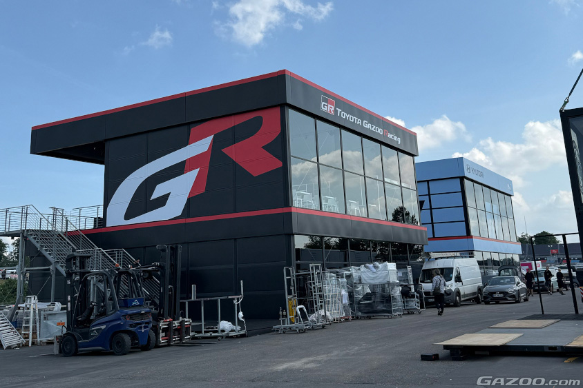 パドックへブラックのダイムラートラックが登場しました。タイミングが良いですね。先日、ダイムラートラック社との提携を発表したばかりでしたので、これもそうかとプチ感動。トラックの中には、もちろんGRヤリスが入っていました。