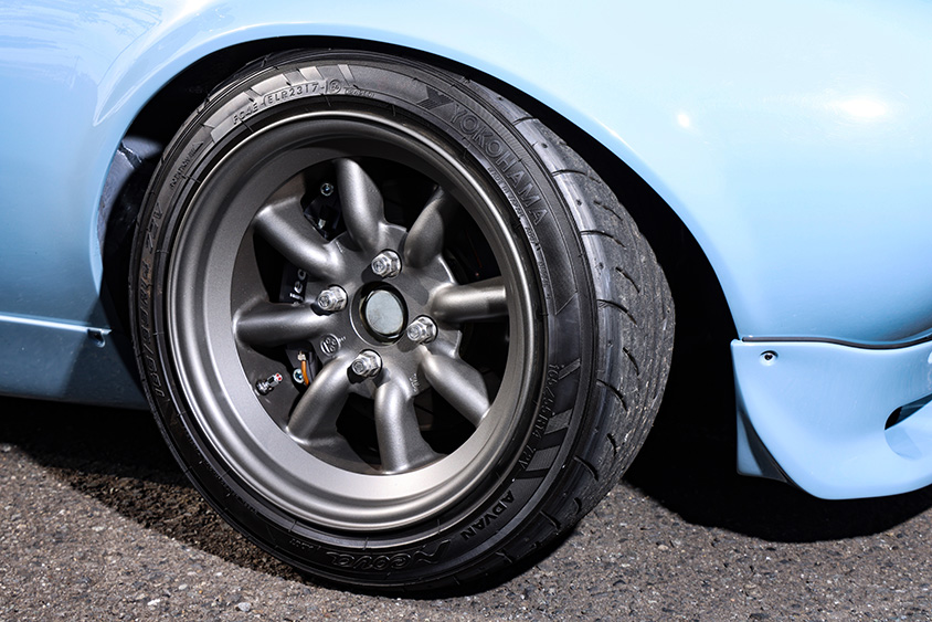 「エンジンルームもロードスターのメンバーを寸詰めして流用したり、ロードスターの足回りを移植したり。ある程度下回りを組んだところで、埼玉の板金屋さんビッキーさんに板金に出してボディワークをレストアしてもらいました。オーバーフェンダーをつけるのが嫌だったので、フェンダーも広げてもらったんです。」