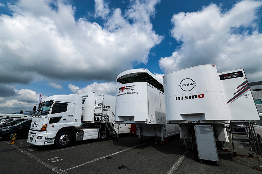 かつてはマシンを運ぶラダー車も、ほとんどが外装のないスケルトンの車が多かった。ところが24時間耐久のパドックにはNISMOやGR Racing、HRCと書かれた大きなトレーラーが軒を連ねている。
