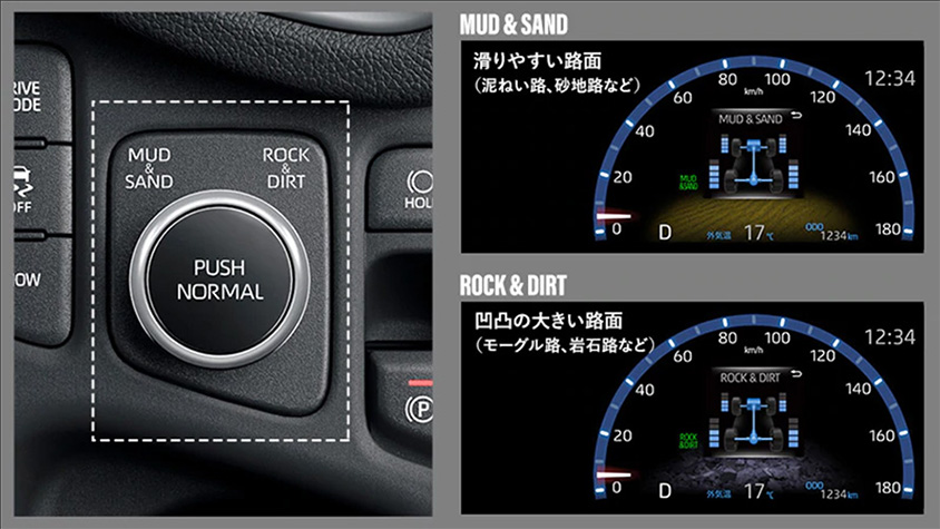 MTSのダイヤルを左に回せば「MUD&SAND」右に回せば「ROCK&DIRT」。押せばノーマルになる