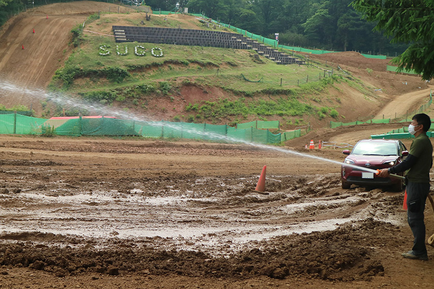 トラクターで耕し、1時間以上散水して作った泥ねい路(ぬかるみ路)。この泥を見ると走るのも不安になる