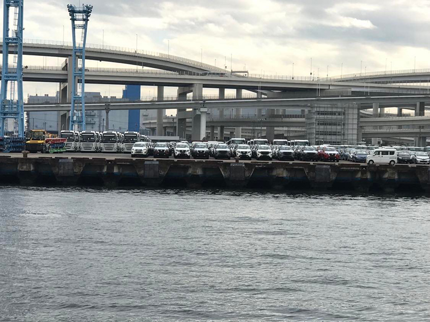 大黒ふ頭のヤードには輸出仕様の日産パトロールや、輸入されたテスラがたくさん並んでいた
