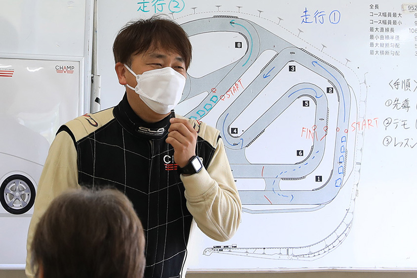 今回のプログラムは、ドライビングポジションから目線、クリッピングポイントの取り方などドライビング理論を座学で学び、実技は1つのコーナーとS字コーナーをそれぞれ反復練習します。