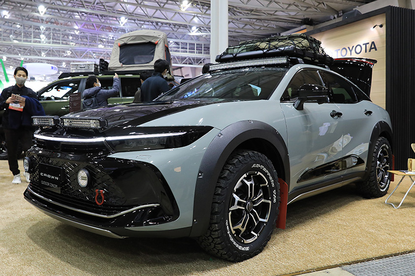 また「トヨタ・クラウンCROSSOVER」は、早くもカスタマイズされて何台も展示されていましたが、併催されたTOKYO OUTDOOR SHOW(TOS)に展示されていたアウトドアコンセプトは、オフロードやキャンプなどアウトドアでの活用がコンセプトでタイヤが大径化(265/60R18)され、スキッドプレートや牽引フックがあったりして目を惹きました。