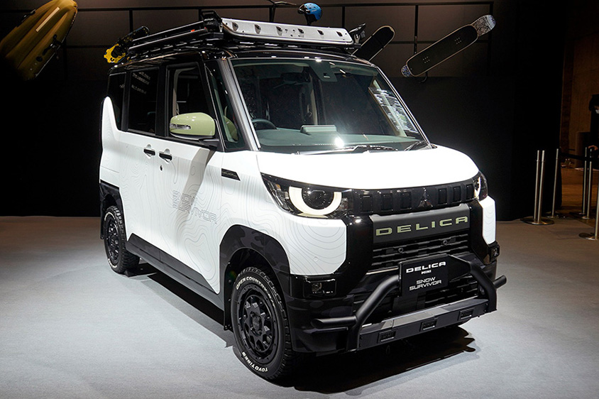 発売前の新型車でまず目立っていたのが、三菱自動車。以前、パジェロが大人気だったときにパジェロミニが誕生しましたが、今回は唯一無二の4WDオフロードミニバンスタイルで長年ファンが多いデリカから「デリカミニ」が誕生。2023年5月に発売されるということですが、さらにカスタマイズして展示されていたことに驚きました。特にスノーサバイバーと名付けられたモデルは、エクステリアにフロントガードバーやルーフキャリア、リヤラダーを装着。サスペンションは50mmリフトアップで165/65R15の純正よりワンサイズ大きいタイヤを履いています。