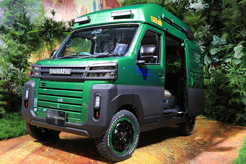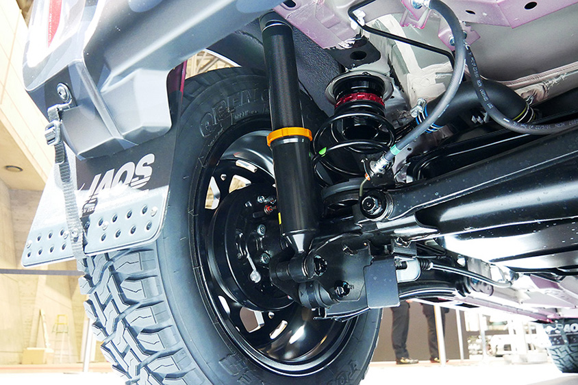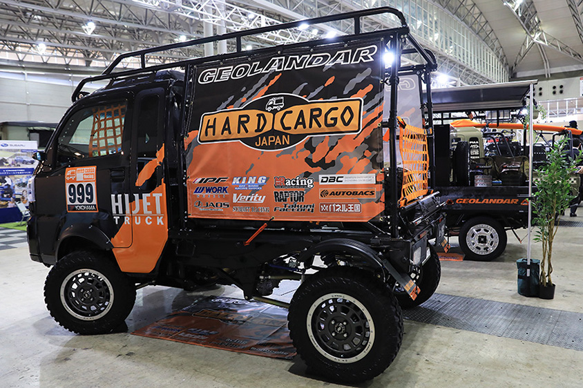 そしてTOSでは、カスタマイズメーカーやタイヤメーカー7社が、HIJET TRUCKを思い思いにカスタマイズしていたのが圧巻でした。特にオフロードをしっかり走れるようにカスタマイズされたHIJET TRUCKは、サスペンション形式まで変えるほど本気です。さすが「夢ふくらむ はじけるダイハツ」をコンセプトにしているだけあって、「山椒は小粒でもぴりりと辛い」を展示車で表現していました。