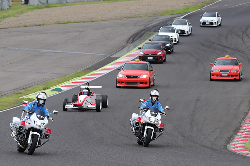 最初は縦一列に並んで走っていましたが、サービス精神旺盛なドライバーは、コース幅を広く使って抜いたり抜かれたりと、まるでレースのなかに自分が入ったかのようなエンターテインメントを演出しながら走ります。