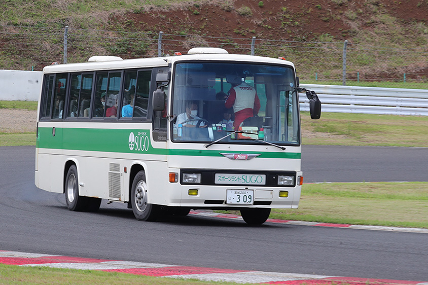 残念ながら抽選に外れて同乗走行ができなかった方、身長が規定未満の小さなお子様連れの方々には、バスを2台用意してサーキットサファリを実施しました。私はバスガイド!?を務めさせていただき、コースの紹介から駆け抜けて行くクルマの解説、ドライバーの紹介を行いました。