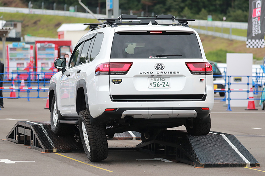 こちらも3名まで乗車でき、空しか見えない階段を昇ったり、30度近く横に傾いてアスファルトが迫ってきたりと非日常を体感できます。それにしてもランドクルーザー300のリヤサスペンションの伸縮がすばらしく、丸太越えでプラドやFJクルーザーでは対角線上にタイヤが浮いてしまう場所でも、4輪が接地して何もなかったかのように越えていくのは圧巻です。ここでも2日間で約1,000名のお客様に同乗いただきました。