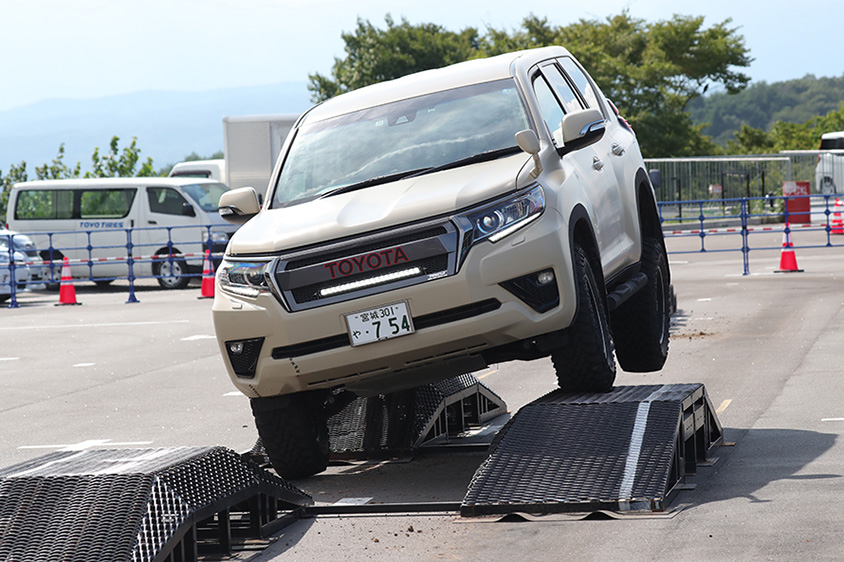 2つめの同乗コンテンツは、ランドクルーザー300、ランドクルーザープラド、FJクルーザーに乗り、鉄製の階段を昇ったり、大きな丸太を越えたりしながら機能体感できるもの。