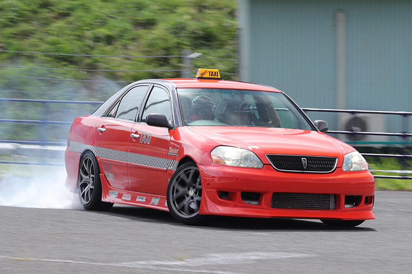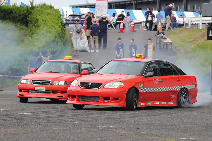 3つめはドリフトの聖地、福島のエビスサーキットをホームとするTeam ORANGEによるドリフトタクシー。2台のオレンジカラーのタクシーがタイヤスモークを上げ、ツインドリフトを決めながら走ります。