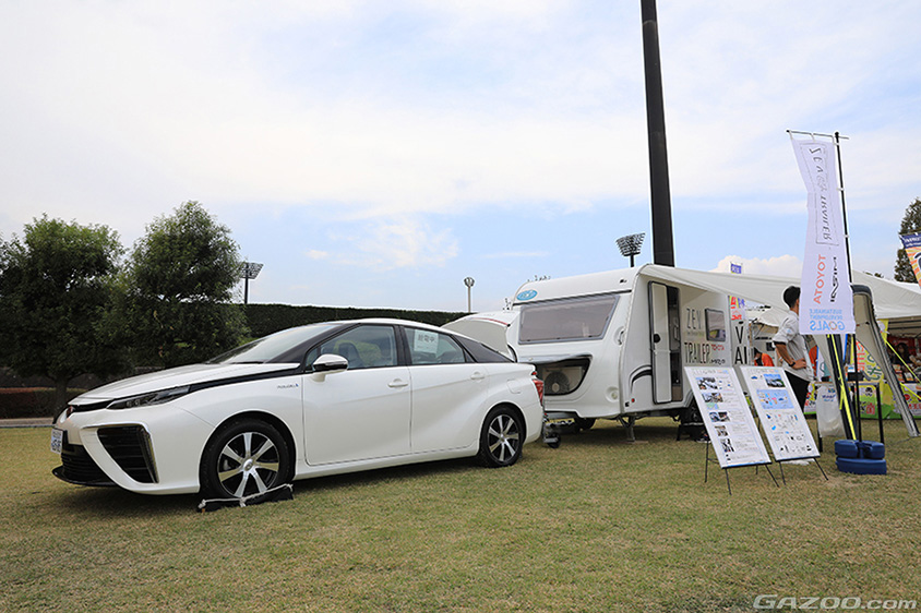 一昔前は気にならなかったんですが、カーボンニュートラルが進められている中、せっかく外へキャンプをしに行っても、ガスコンロやエンジン発電機を使ってCO2を出すだけでなく、特に発電機は自然の静寂も損ねてしまうなど、少し気になってしまう時代になってきました。そこで最初に目についたのが初代ミライで牽引している「ZEV TRAILER」。