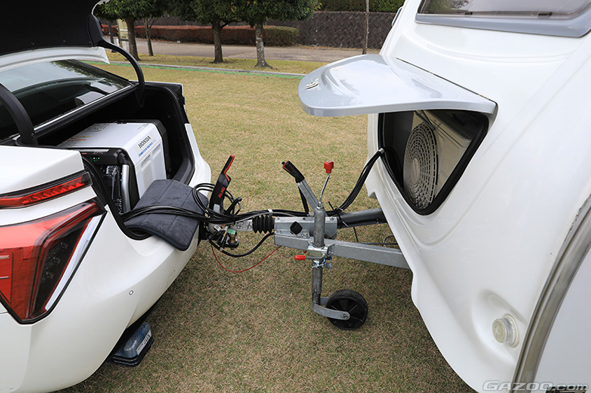 このZEV TRAILERは、ミライから取り出した電気をトランクに積んだホンダの可搬型給電器で直流から交流に変換してトレーラーに送ることで、電化調理器具や掃除機など室内で使う電気をまかなうことができます。