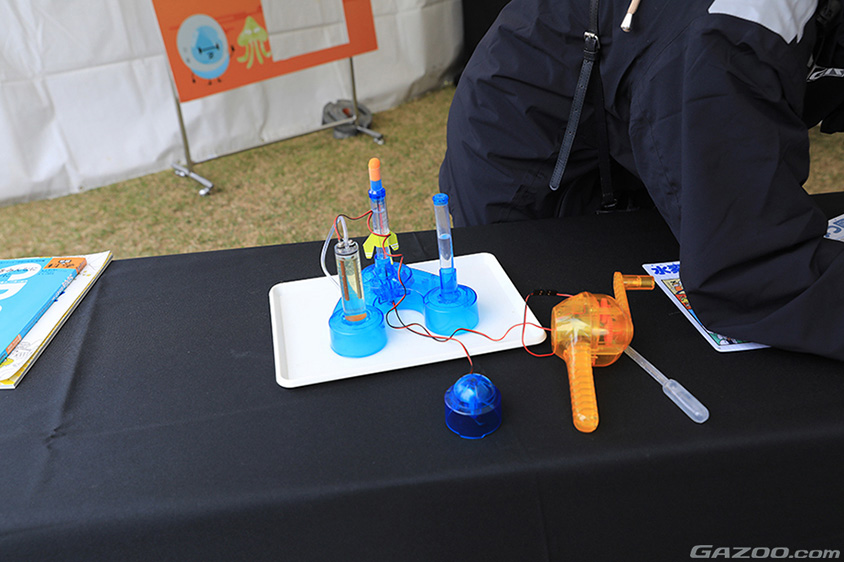 次におもしろかったのが「水素エネルギーロケット」。こちらは子供たちに毎回大人気のコンテンツということですが、これは学研の科学のキットで、リールのような手回し発電機で発電し、水を電気分解して水素を作り、その水素に点火してロケットを飛ばすというものです。