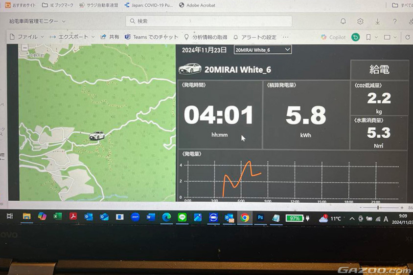 現場にいるミライの発電量、水素消費量、CO2削減量がPCで確認できる