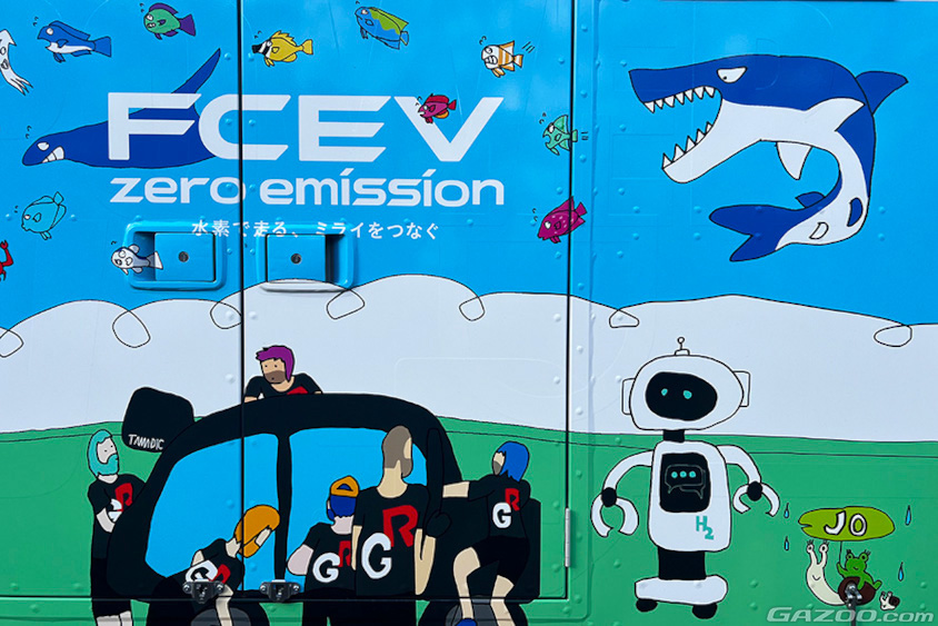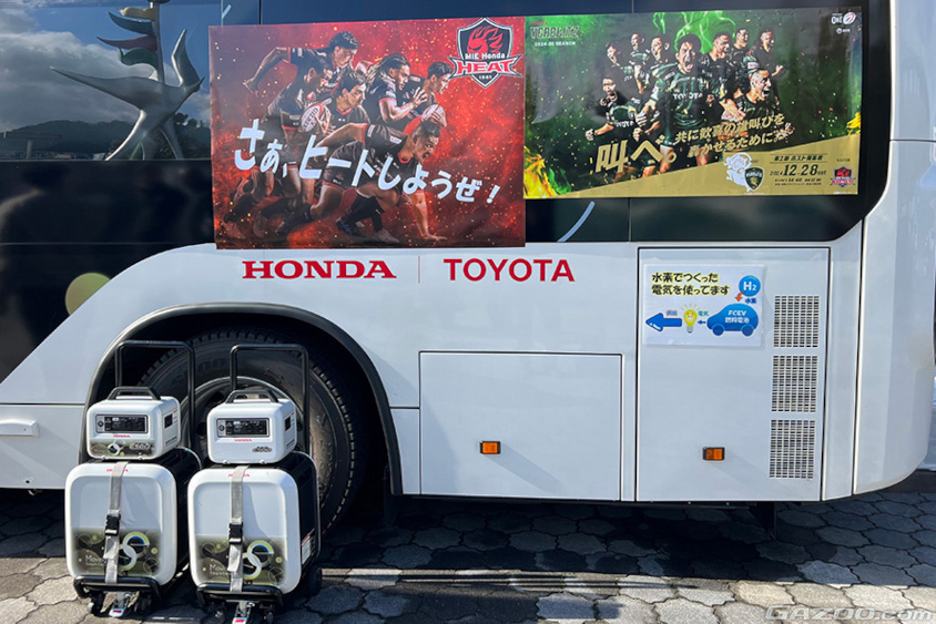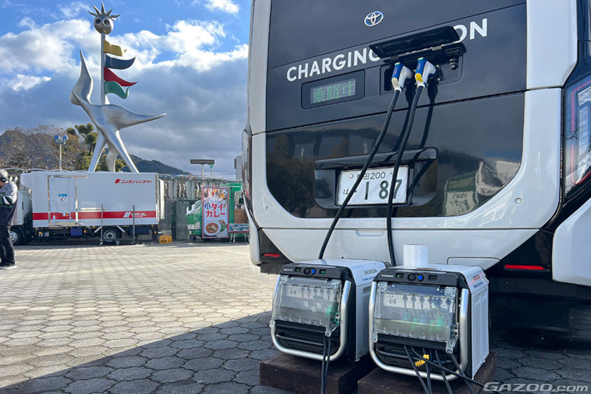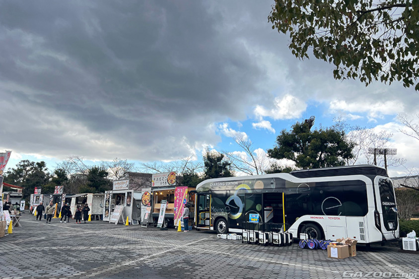 今回もトヨタとホンダで共同構築した、水素で走行する移動式発電・給電システム「Moving e(ムービング イー)」がベース。トヨタの燃料電池バス「CHARGING STATION」をマザーシップに、バスからホンダの外部給電器「Power Exporter e: 9000」を介して充電・給電器「Honda Mobile Power Pod e:」に組み込んだ可搬型バッテリー「Honda Mobile Power Pack」を充電して各キッチンカーに配ったり、トヨタ・ミライ、クラウンFCEVから給電を行っていました。