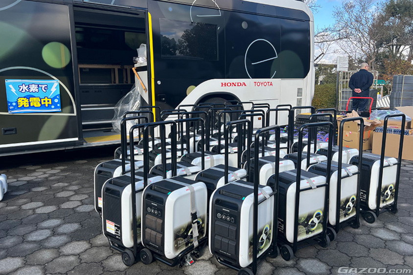 ミライやクラウンFCEV、CR-V e:FCEVから可搬型給電器を介した給電では、機種にもよりますが最大9,000Wまでなので、さらに電力が必要なTV中継車には今回新たに定置型FC発電機から給電していました。
