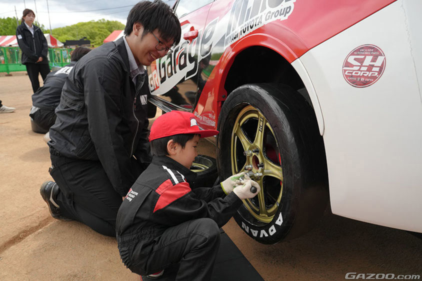 そして子供たちはミニ四駆を組み立てて特設コースを走らせます。また人気なのがツナギに着替えてメカニックになってタイヤ脱着体験。