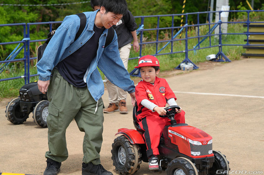 さらにキッズバイクにも乗れ、今回はモトクロスコース内のオフロードで実施。凸凹の路面にドキドキしながらライディングを親子で力を合わせながら上達していく姿が微笑ましいです。トラクターの乗り物にも乗れます。