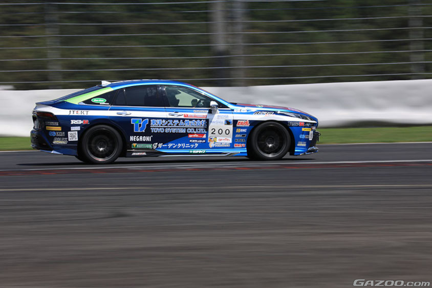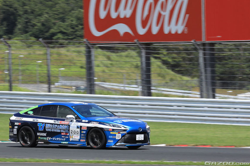 そして30分が過ぎ、ドライバーとして、じわっとアクセルをやさしく踏み込みながらコースイン。1周目は一年ぶりの感覚を取り戻しつつ、水素消費量のインジケーターをみながら効率のいいアクセルワークを見つけていきます。