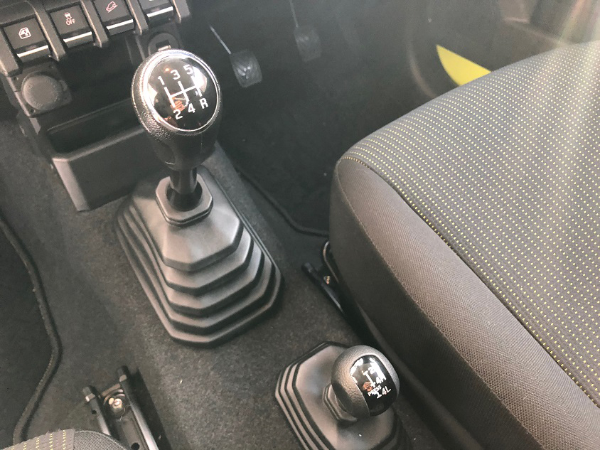 試乗車は5速MT! 高速道路を走っていると、正直「もう1速あってもいいよ♡」と思うのですが(笑)、ともかく縦置きトランスミッションから伝わるダイレクトなシフトフィールは操作していて楽しい。特にジムニーのような機械感のあるクルマだと、対話している感じが断然高まります。その後ろにあるのはトランスファーレバー。これを切り替えたとき、なんだか大人になった気がしました(笑)。
