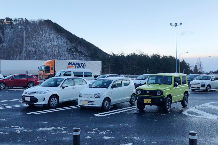 パーキングでのひとコマ。こうして見ると、背が高いですよね。とはいえトールワゴンのように低床ではないですから、重心が高くて横風の影響は受けます。特に今回はスタッドレスタイヤを履いていた上に風が強かったので、ちょっと運転していて怖かった。そういうときは、焦らずにゆっくり走るのがベストです。