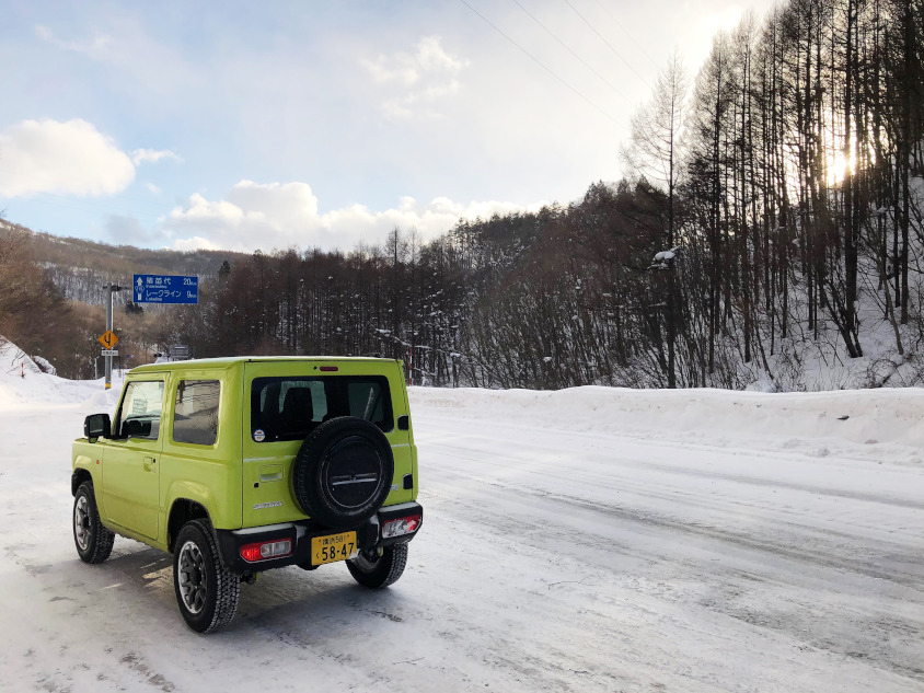 箕輪スキー場へと向かう山道は、正に白銀の世界。生活の中に雪がある“本場”を、私のようなスノーアマチュアが安心して走る上で、この4WDの安定感は、本当に心強かった。特別パワーがあるわけでも、ゴリゴリの走破性を見せつけるわけでもない。ただひたすら木訥(ぼくとつ)に、しかし着実に雪と氷に覆われた登坂道をジムニーは登ってくれました。これがジムニー本来の姿ですよ。