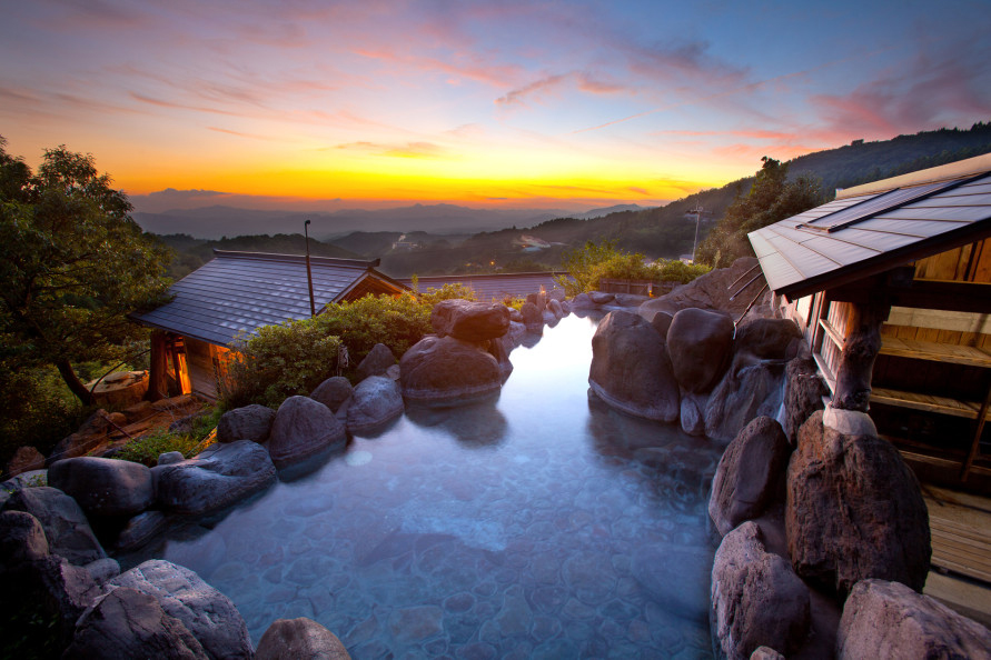 小国町の涌蓋(わいた)山麓に10軒ほどの温泉施設が点在する、わいた温泉郷。はげの湯、岳(たけ)の湯、山川温泉などのエリアに湯宿が並び、阿蘇の山々を背に湯けむりが立ちのぼる人気の温泉郷だ。はげの湯エリアにある「峐(はげ)の湯温泉 旅館 山翠」には、標高約800mから絶景を望む混浴露天風呂「仙人の湯」(トップ画像)をはじめ、男女別の露天風呂や洞窟風呂など18の温泉風呂が揃う。家族風呂以外は日帰りでの利用も可能。休憩所があり、奥阿蘇の秘湯をじっくりと楽しめる。