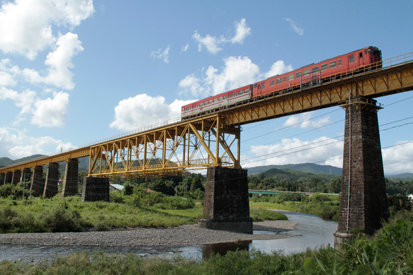 阿賀野川水系一ノ戸川に架かる、レトロな形状の上路式トラス橋。橋梁は「福島遺産百選」、橋を渡る列車の走行音は「うつくしまの音30景」に選定されている。
