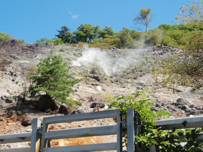 水蒸気とともに硫黄ガスが噴出し、硫黄の匂いがたちこめる。