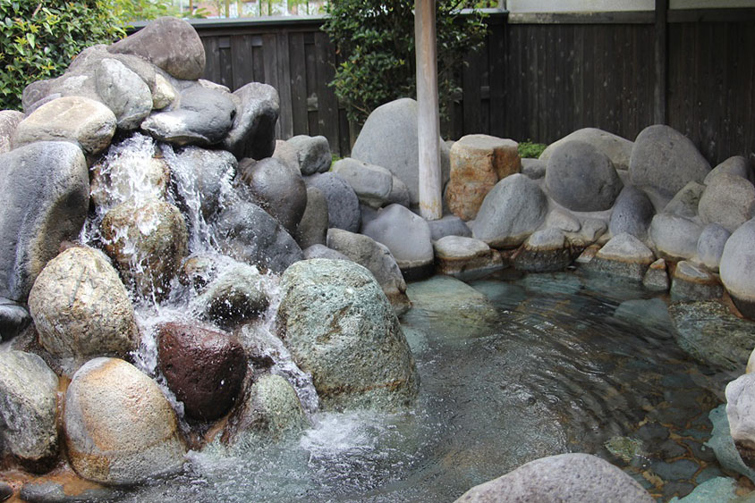 大きな岩から温泉が豪快に注ぎ込む、自慢の露天風呂。