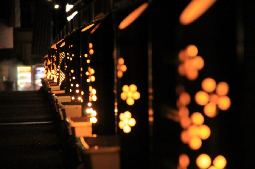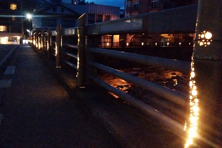 温泉街を流れる箒川に架かる蓬莱橋や八汐橋などに、竹灯篭の光が灯る。
