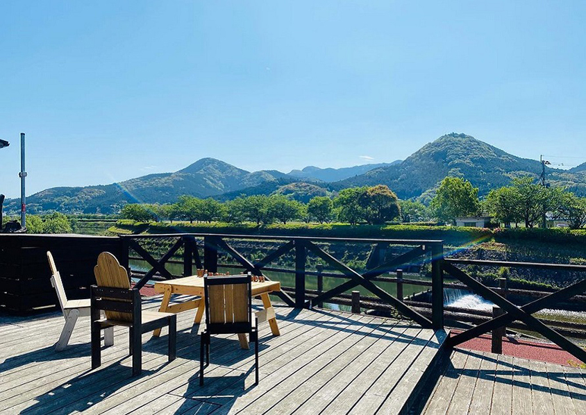 日当たりのよい屋外テラス席は、川棚川のせせらぎが聞こえてきそう。