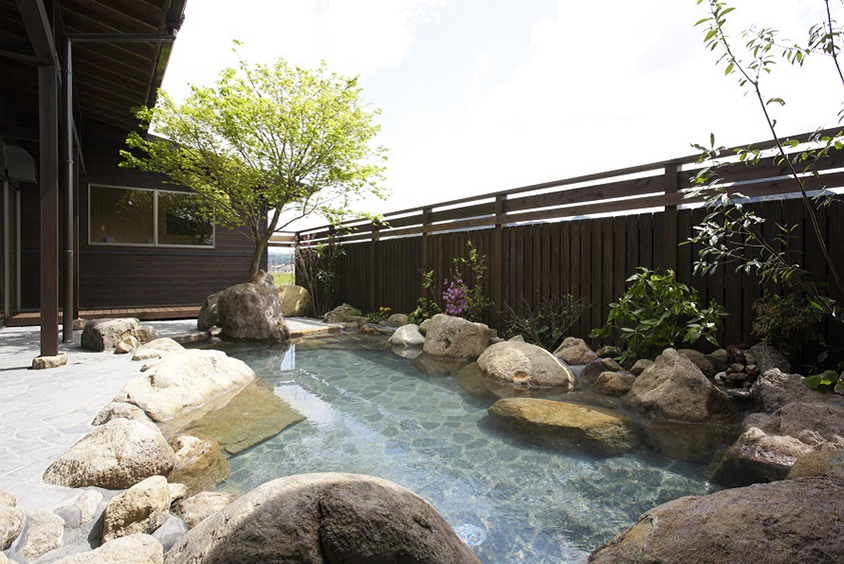開放感いっぱいの露天風呂。夜はライトアップされる。