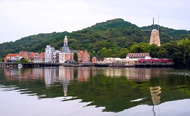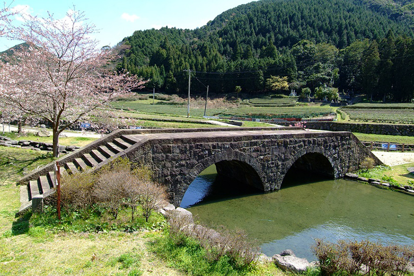帰りははさみ温泉湯治楼から車で約15分の「稗ノ尾(ひえのお)の眼鏡橋」へ。町内に唯一残された見事な眼鏡橋で、明治41年(1908)に石造り双円アーチ橋として架橋され、防災工事にともない現在の場所に移築された。頑丈な造りで、焼きものの産地である永尾・三股両郷を結ぶ、陶石や焼物荷などを馬車で運搬するための石橋として活用されたという。