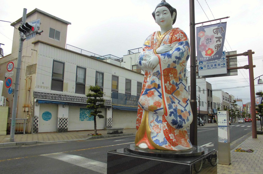 伊万里駅近くの商店街に建つ古伊万里美人像。道の両脇に1体ずつ、計2体ある。