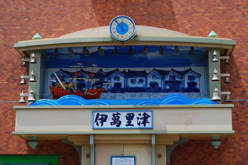 佐賀銀行伊万里支店前の古伊万里からくり時計。愛称は万里音(まりおん)。