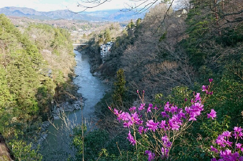 下栗の里から車で約60分の「天龍峡」は、長野県を流れる天竜川沿いに険しい断崖や岩壁が続く景勝地。川下りや紅葉スポットとしても知られる人気観光地だ。例年5月上旬頃までミツバツツジが咲き、うららかな春の光景が広がる。2019年11月には天龍峡大橋が架けられ、新しいドライブウェイが誕生。車道の下には歩道「そらさんぽ天龍峡」が設けられ、川下りの舟や線路を走る列車を小さなミニチュアのように見下ろせる。