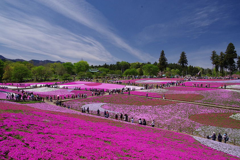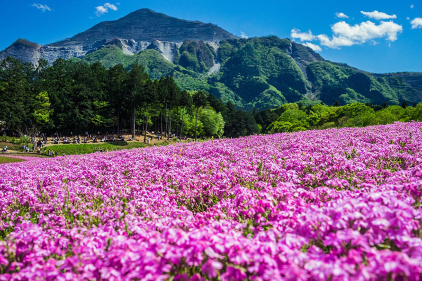 秩父市の「羊山公園(ひつじやまこうえん)」は、四季折々の自然風景が広がる憩いの場。春に10品種40万株以上にも及ぶシバザクラのじゅうたんが一面を埋める光景は「芝桜の丘」と呼ばれ、4月中旬から5月上旬の開花期には遠方からも多くの人が訪れる。秩父のシンボル、武甲山を望む丘陵地に、ピンクや白、淡いブルーの花が芝生のように地面を覆う光景は圧巻の一言。植栽面積は約17600㎢と関東有数の規模を誇る。毎年楽しみにしている人も多い、秩父の春を象徴するシバザクラを堪能しよう。