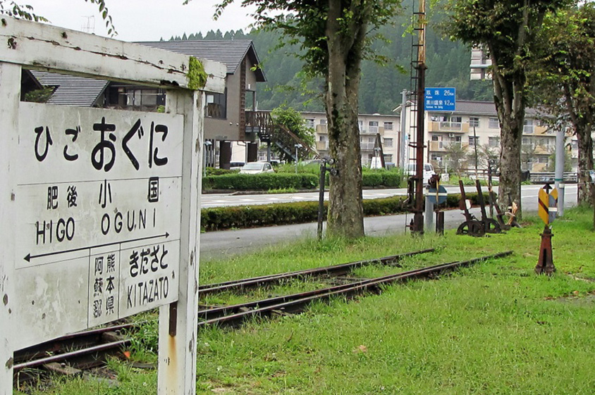旧肥後小国駅跡。駅名を記した看板や線路は、実際に以前使われていたものを補修してモニュメントとして展示している。