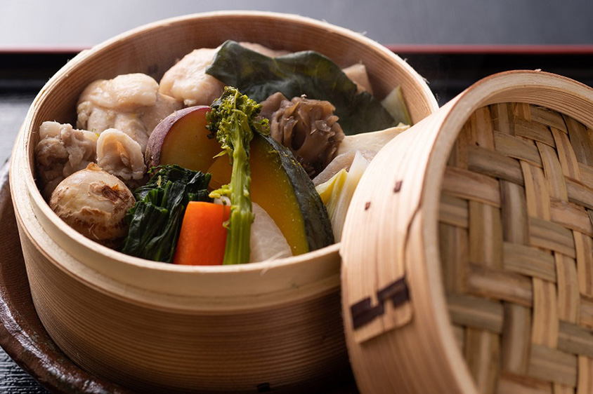 「若鶏と野菜の蒸篭セット」1600円(税込)。ほかにも「天空のだご汁セット」1000円、「あか牛のセット」1800円(ともに税込)などが食べられる。