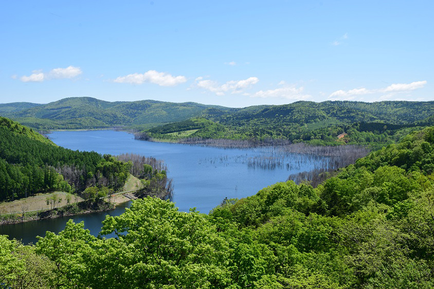 「象の鼻森林公園展望台」は、標高約238mの丘に建つ展望台。手塩川水系サンル川に位置するサンルダムは2019年に完成した。展望台から見下ろせるサンルダムのダム湖「しもかわ珊瑠湖」の名は、公募により下川町はじめ全国から寄せられた名前をもとに決定したもの。