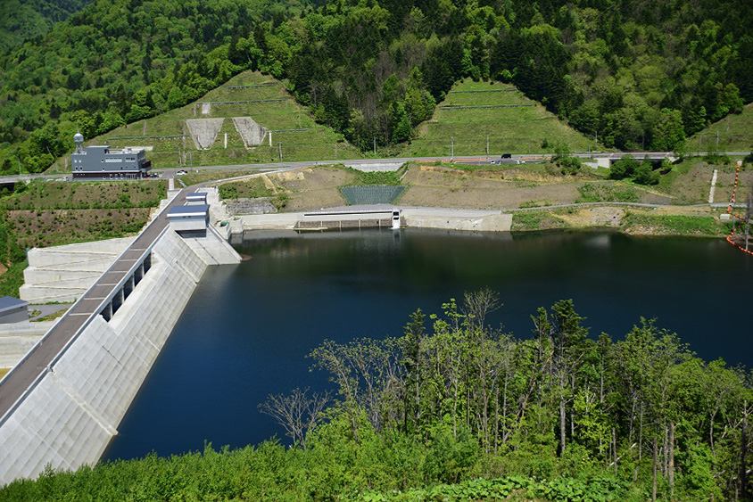 台形形状の新型ダム。サクラマスの生息環境に留意した日本最大級の魚道も設けられている。