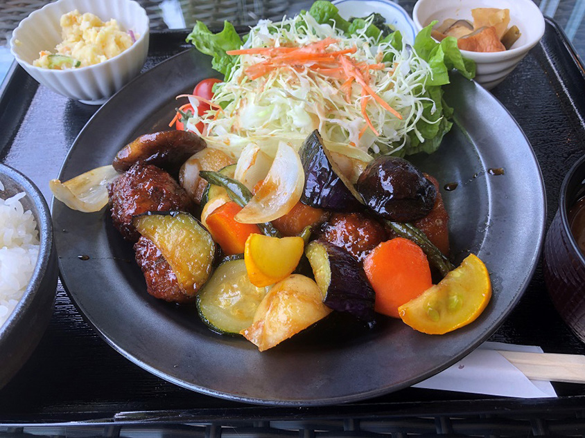 「山のレストランふるさと」の「チョウザメだんごの香酢定食」1000円(税込)。地元のお母さんによる手作り料理。