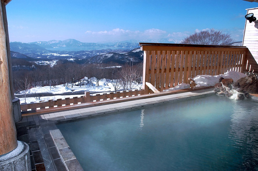 田沢湖の雄大な景観を一望できる露天風呂。岩風呂とヒバ風呂の2種類ある露天風呂は、1週間ごとに男湯と女湯が入れ替わる。