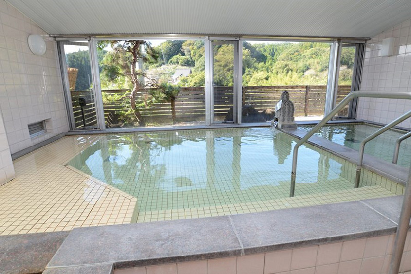 窓から緑が見える内湯も広々。肌にやさしい湯で温まろう。